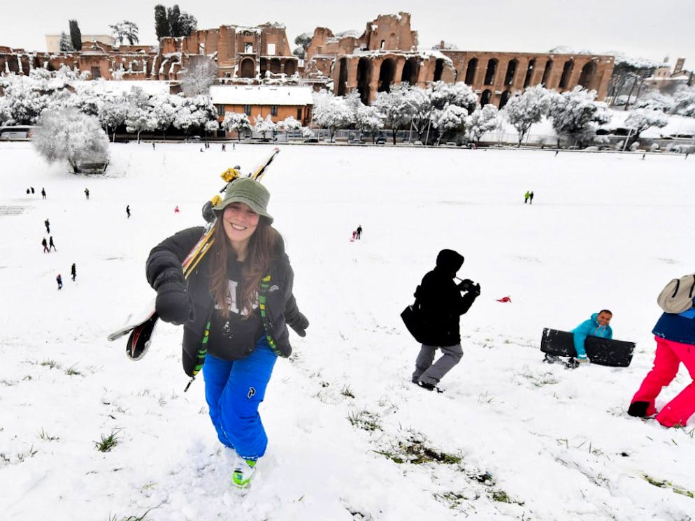 Der Schnee in Rom lädt zu einer kurzen Ski-Abfahrt vor dem Circus Maximus ein.