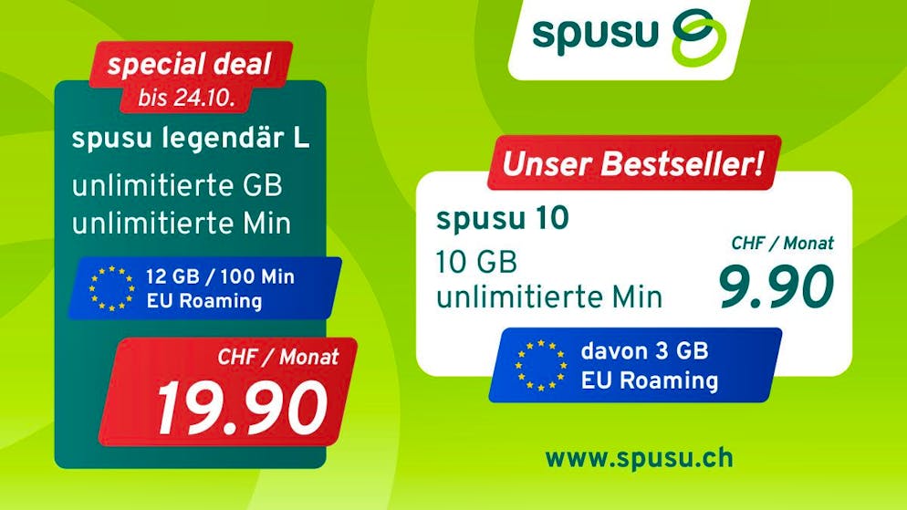 Aktuell bietet spusu das Abo «spusu legendär L» mit unlimitiertem Datenvolumen im 5G-Netz, unlimitierten Minuten und SMS für nur Fr. 19.90 Ausserdem inkludiert: 12 GB, 100 Minuten und 100 SMS im EU-Roaming. Für Wenigverbraucher eignet sich das Abo «spusu 10» für Fr. 9.90 mit 10 GB, unlimitierten Minuten und SMS und 3 GB im EU-Roaming.