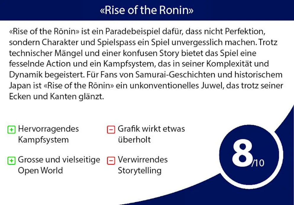«Rise of the Ronin» ist ein PS5-exklusives Spiel, das trotz grafischer und technischer Mängel durch sein atmosphärisches Setting, das fesselnde Kampfsystem und die lebendige Open-World-Erfahrung besticht.