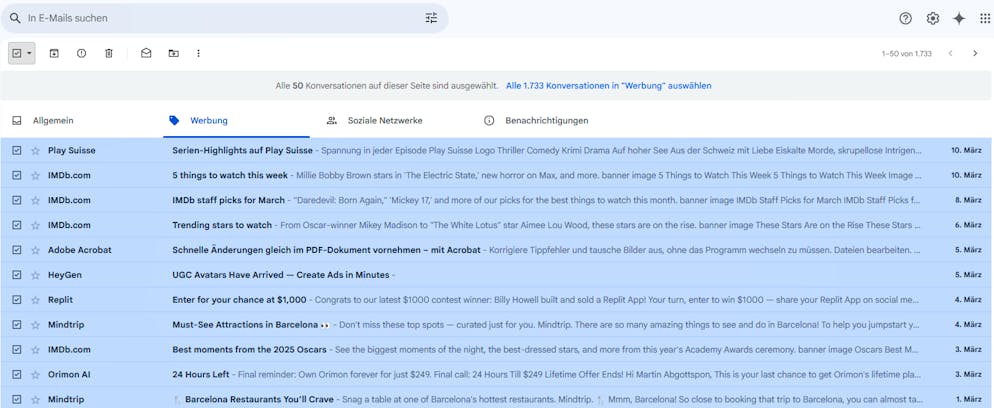 Der wohl einfachste Weg, den Gmail-Speicher zu entschlacken, führt über die voreingestellten Registerkarten des Posteingangs. Google sortiert E-Mails in Kategorien wie «Werbung», «Soziale Netzwerke» oder «Benachrichtigungen». Besonders die Werbung-Sektion ist oft voller ungenutzter Angebote und Newsletter, die man ohne Bedenken im grossen Stil entfernen kann. Und so geht's.