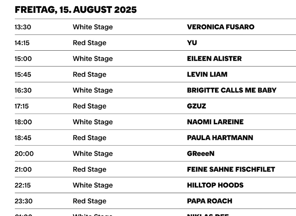 - Die diesjährigen Headliner sind top. Darunter sind Kontra K., Papa Roach, Feine Sahne Fischfilet, Fanta Vier und Joya Marleen.