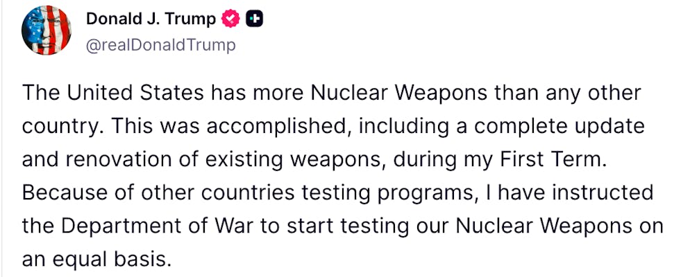 Bild: Screenshot Truth SocialDer US-Präsident hatte sich vor einer Woche bereits exakt so geäussert und damit weltweit für Aufsehen gesorgt, zumal es für den Test von Atomwaffen seit Jahrzehnten ein Moratorium gibt. Die USA hatten ihren letzten Test 1992 durchgeführt. Am Mittwoch war bekanntgeworden, dass der russische Präsident Wladimir Putin seine Regierung anwies, die Zweckmässigkeit möglicher Atomwaffentests zu prüfen.