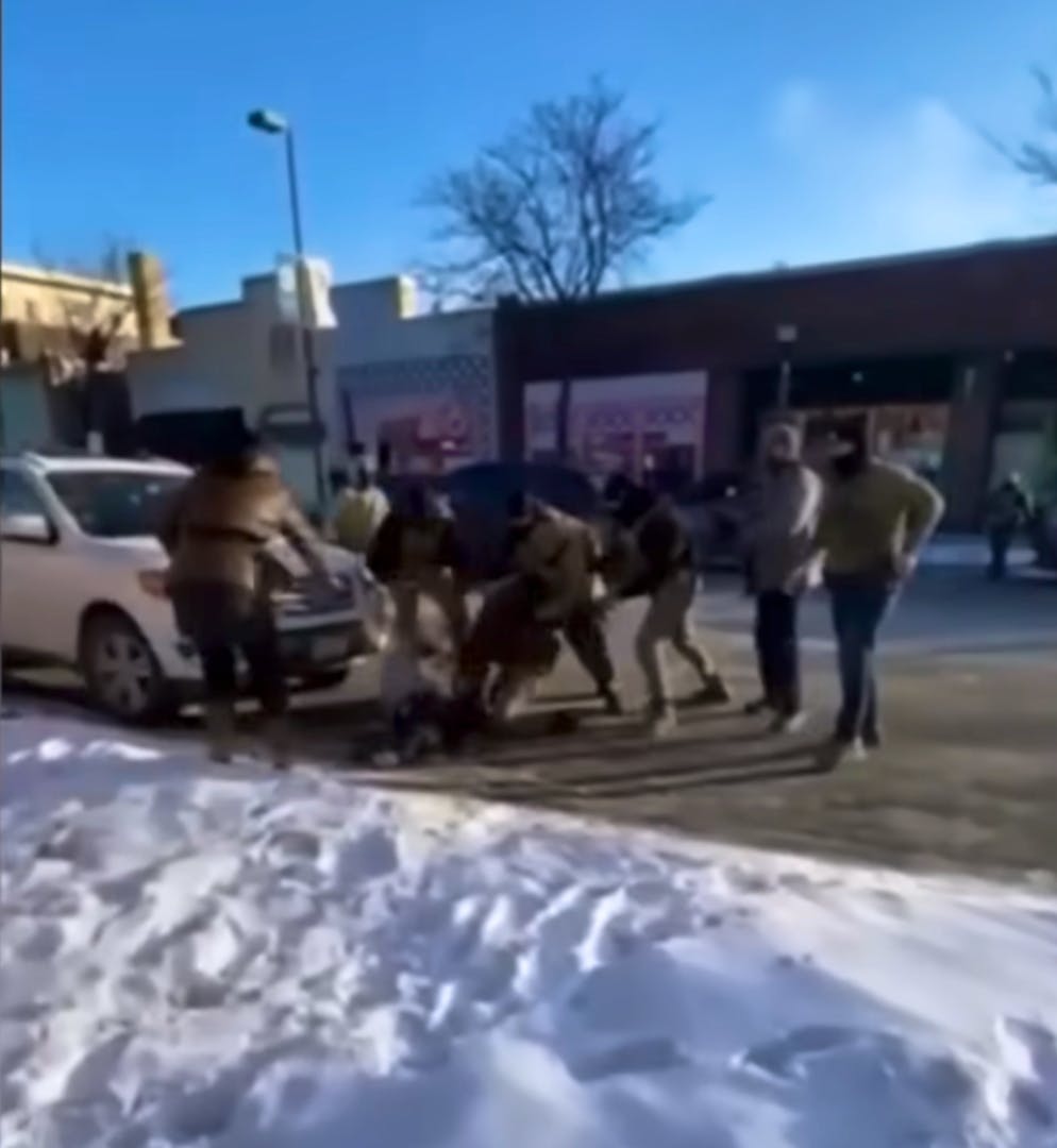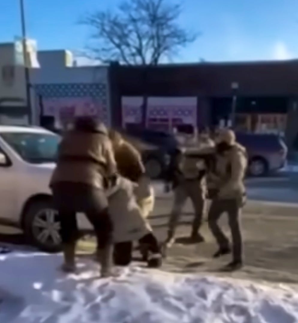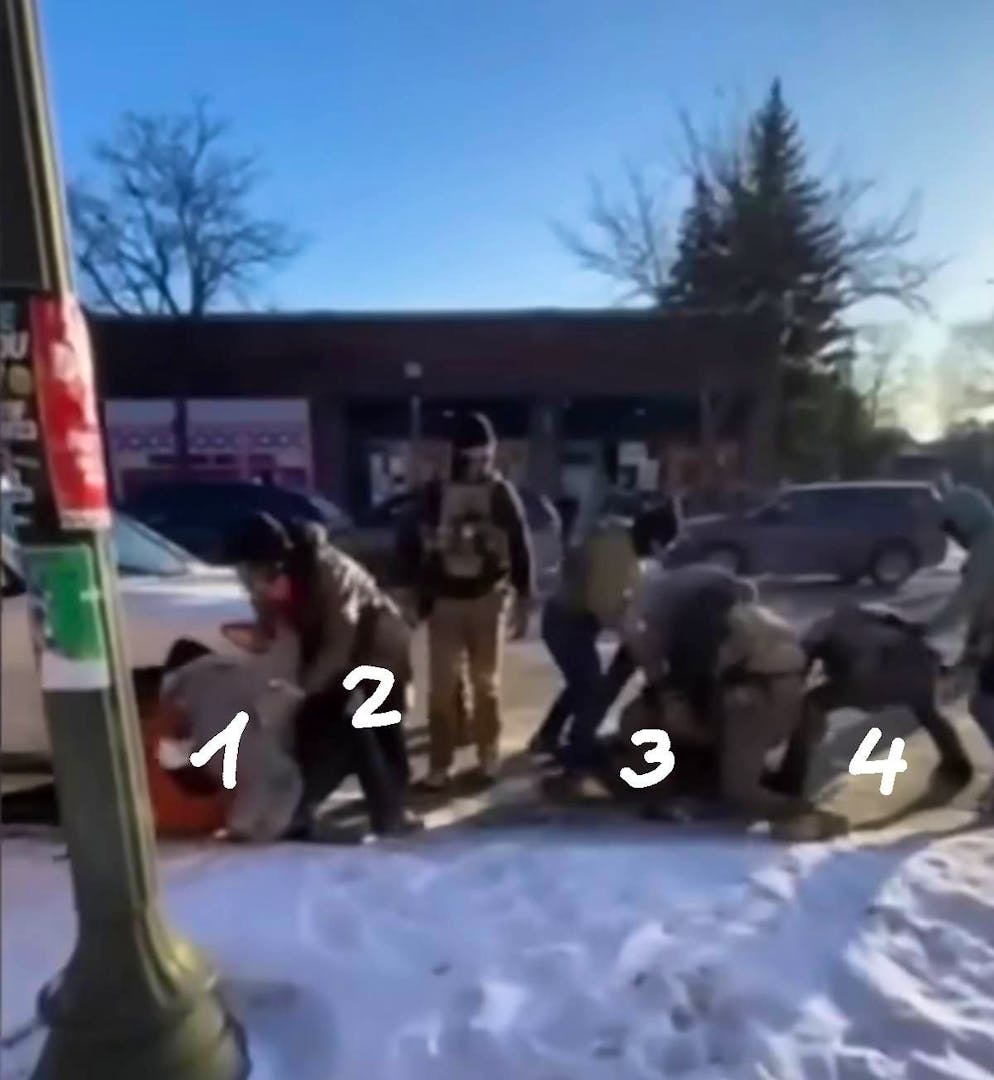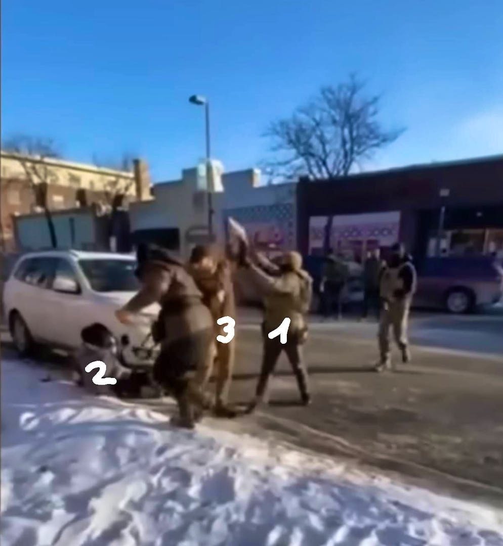Im Hintergrund sind die ICE-Agenten zu sehen. Vorne rechts Alex Pretti, der mit dem Handy in seiner rechten Hand (verdeckt) den Vorgang filmt und mit links einem Auto, das angehalten hat, bedeutet, es könne weiterfahren.
