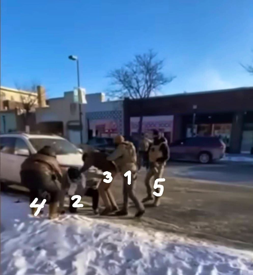 Der Bundesbeamte (1) sprüht Pretti (3) mit einem Reizgas ein. Der dreht sich weg, während eine Person (4) der niedergestossenen Frau (2) hilft, aufzustehen. Ein weiterer ICE-Agent (5) kommt hinzu.