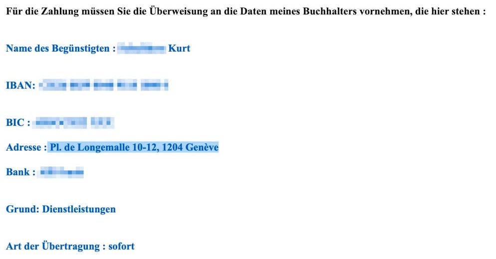 Was der nicht weiss: Der Name des «Buchhalters» findet sich unter der angegebenen Adresse nicht. Nur eine Galerie und eine Bank haben dort ihren Sitz. Es handelt sich dabei aber nicht um die Bank, die die Kautionszahlung empfängt.