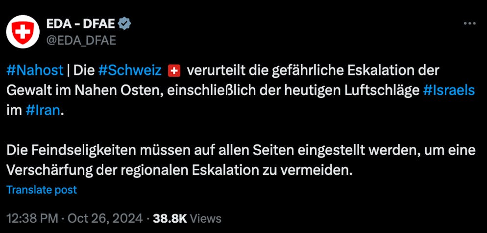 Auf X schreibt das Eidgenössische Departement für auswärtige Angelegenheiten (EDA): «Die Schweiz verurteilt die gefährliche Eskalation der Gewalt im Nahen Osten, einschlieẞlich der heutigen Luftschläge Israels im Iran.»