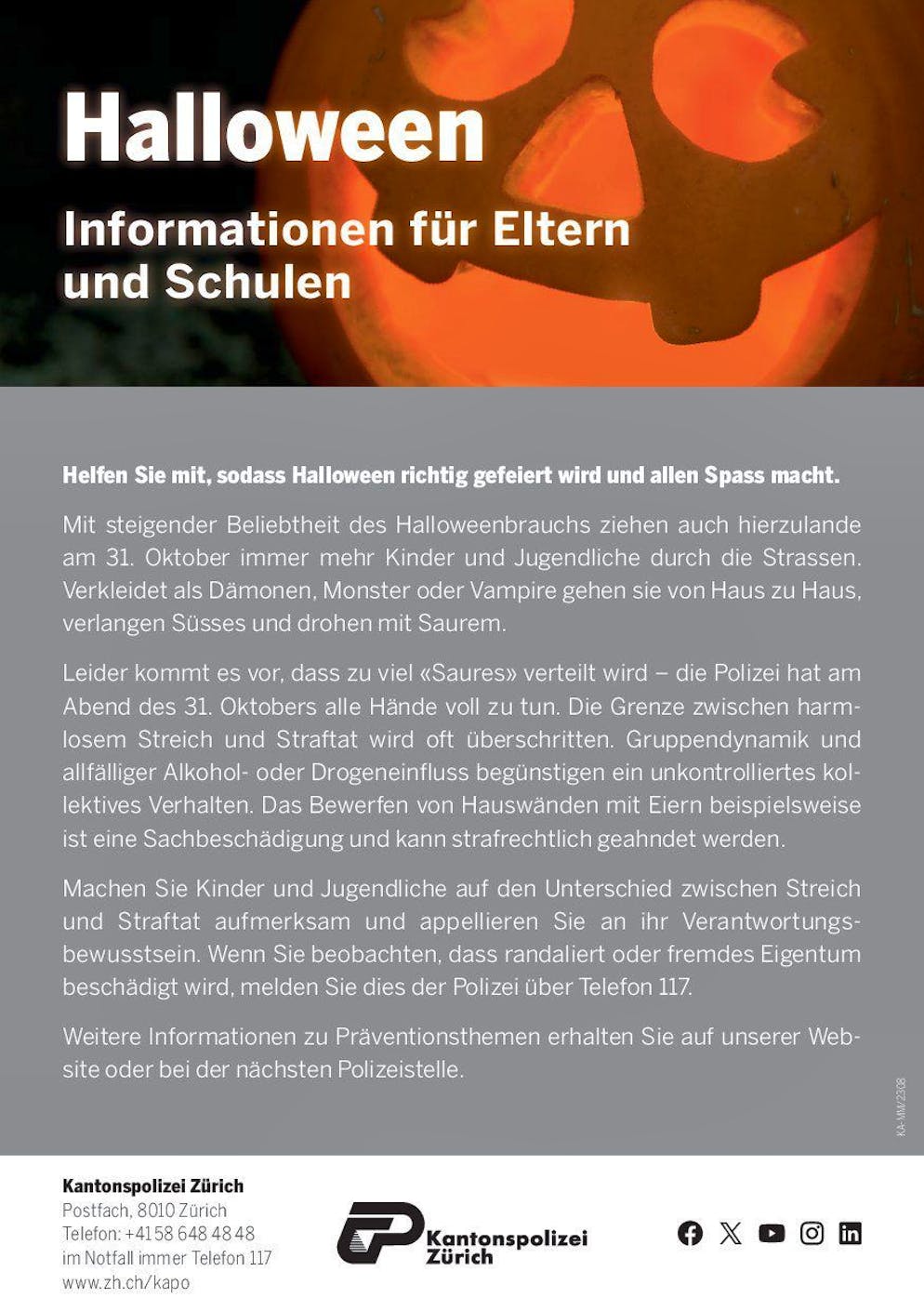 Die Kantonspolizei antwortet kurz und knapp auf die Anfrage von blue News, sie werde sichtbar präsent sein. Zur Frage der Vorkommnisse verweist sie auf die Medienmitteilungen der letzten Jahre. 2024 meldete sie rund 50 Einsätze im ganzen Kanton: «In den meisten Fällen handelte es sich um Eierwürfe gegen Fassaden und Fahrzeuge oder das Abbrennen von Pyrotechnik. Zwei Linienbusse wurden durch Steinwürfe beschädigt.» In Winterthur ist der Polizei am Halloween-Abend 2024 ein Raubüberfall gemeldet worden, verübt von mehreren Maskierten.
