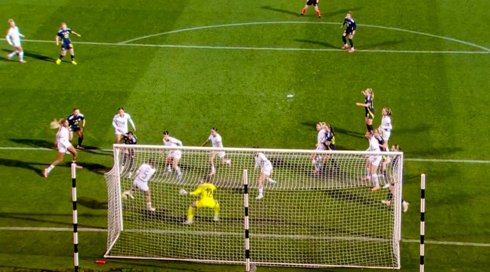 Peng unterschätzt einen hohen Ball komplett, danach hat die Schweiz grosses Glück, dass die Schottinnen die Kugel nicht über die Linie schieben.