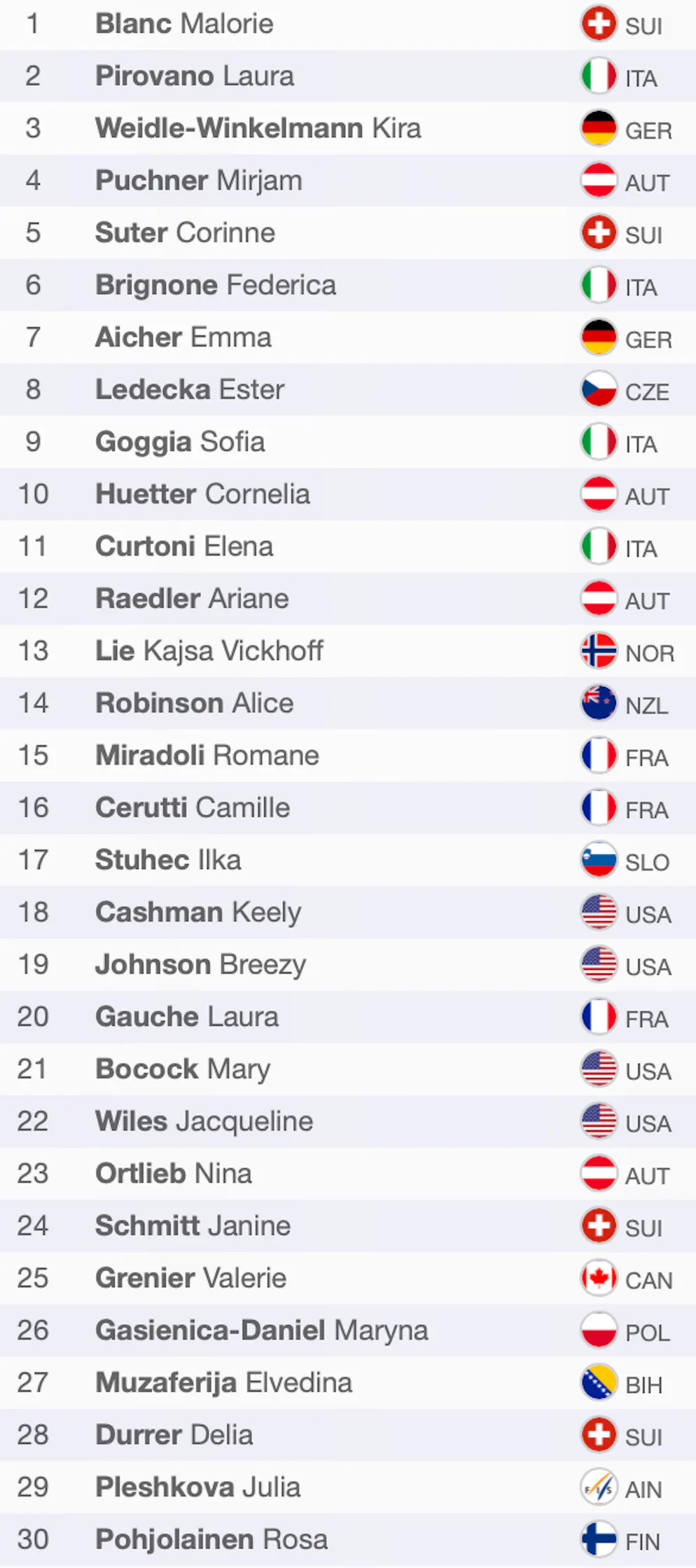Auch Laura Pirovano hat einige Probleme, nimmt Blanc im Mittelabschnitt aber viel Zeit ab. Am Ende hat die Italienerin fast eine halbe Sekunde Vorsprung auf die Schweizerin.