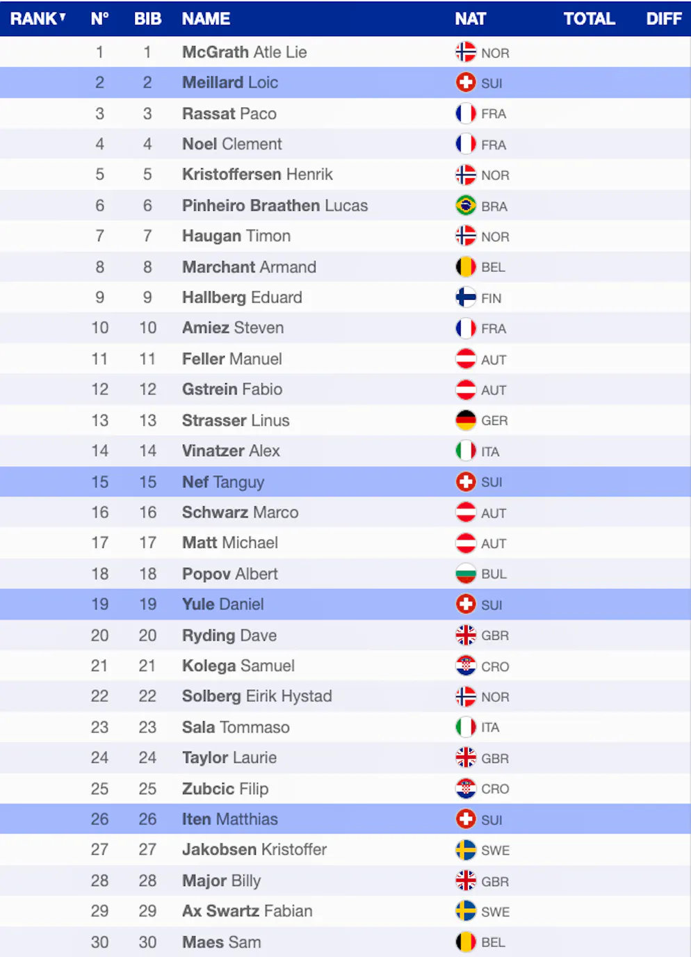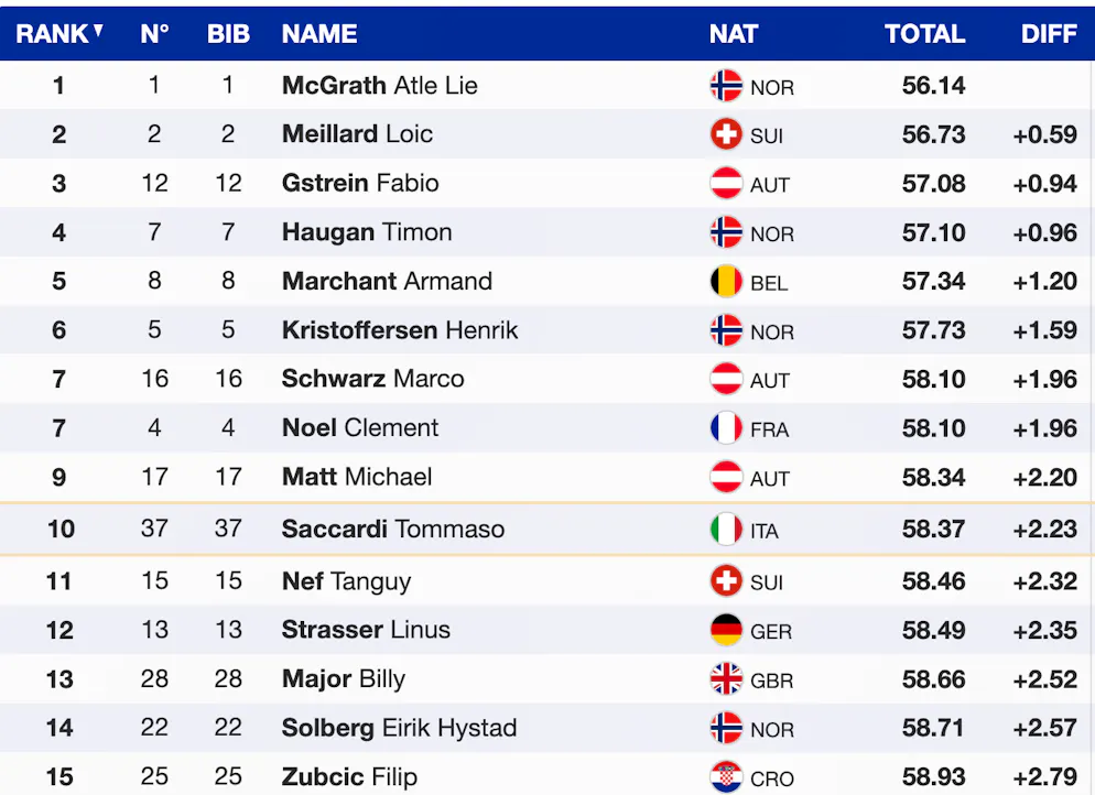 Der Norweger holt offenbar das Maximum raus, was hier noch möglich ist. Haugan hält den Rückstand unter einer Sekunde und ist damit auf Zwischenrang 3. Meillard damit weiter unangefochten auf Zwischenrang 2.