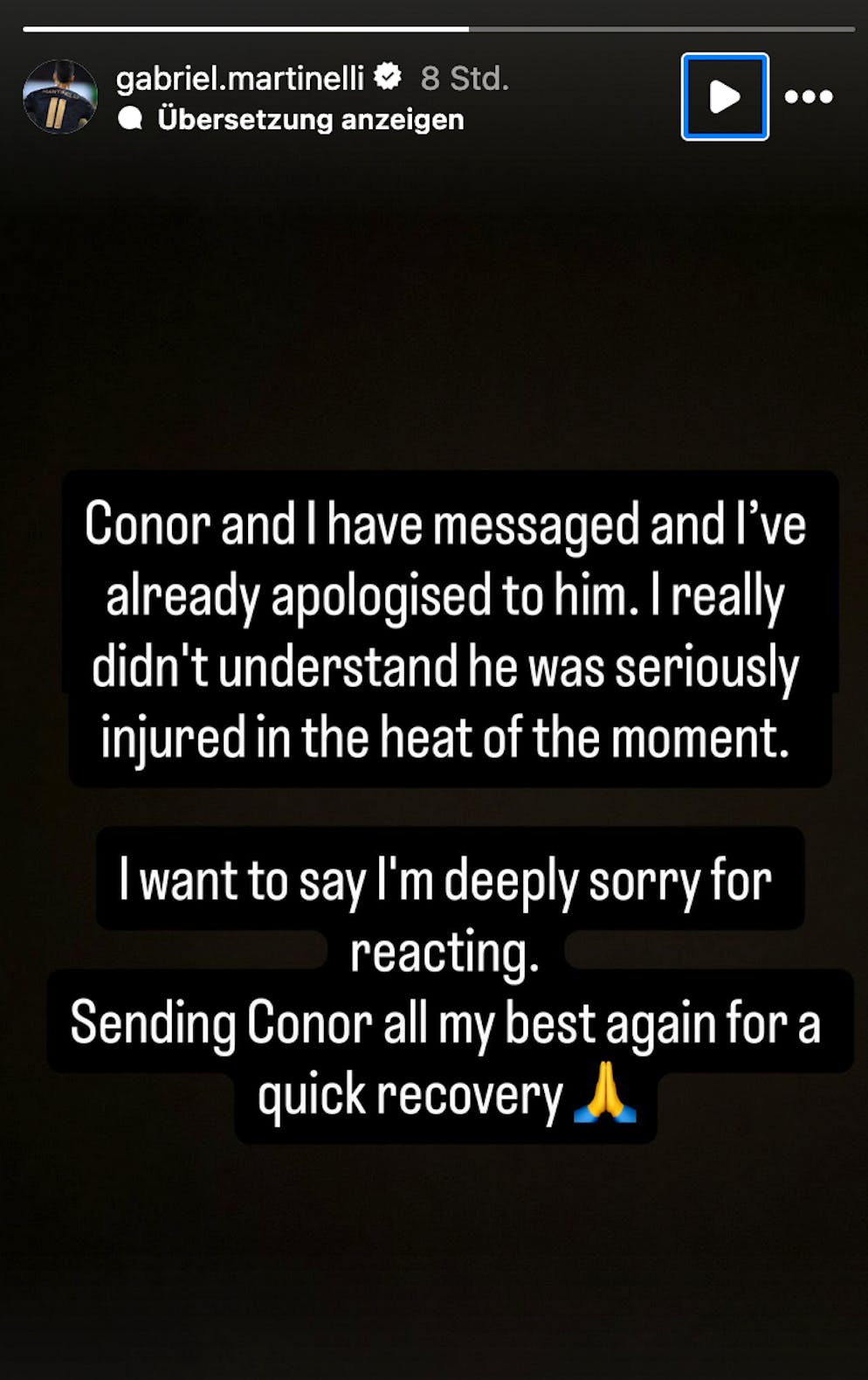 Martinelli hat den Ernst der Lage nach Spielschluss auch erkannt und sich via Instagram zu Wort gemeldet. «Conor und ich hatten bereits Kontakt und ich habe mich bei ihm entschuldigt. In der Hitze des Gefechts habe ich wirklich nicht gemerkt, dass er sich ernsthaft verletzt hat», schreibt der Brasilianer. «Wie ich reagiert habe, tut mir sehr leid. Ich wünsche Conor alles Gute für eine schnelle Genesung.»