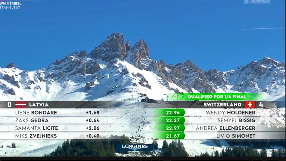Wendy Holdener nimmt ihrer Gegnerin Liene Bondare auf 23 Fahrsekunden 1,68 Sekunden ab und legt für die Schweiz vor. Anschliessend gibt sich auch Semyel Bissig keine Blösse und baut die Führung aus. Damit kann Andrea Ellenberger als dritte Fahrerin den Einzug in den Viertelfinal bereits sicherstellen – und tut das souverän. Zum Abschluss gewinnt auch Livio Simonet sein Duell – die Schweiz schlägt Lettland mit 4:0.