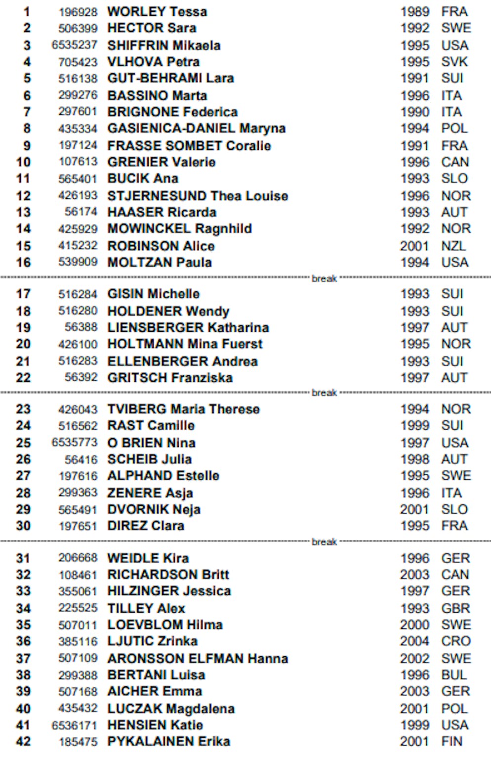 Zweitbeste Schweizerin am Donnerstag war Camille Rast auf Platz 14, vier Positionen vor Wendy Holdener. Michelle Gisin musste sich mit Rang 28 begnügen. Andrea Ellenberger war im ersten Lauf nach ansprechenden Zwischenzeiten gestürzt.