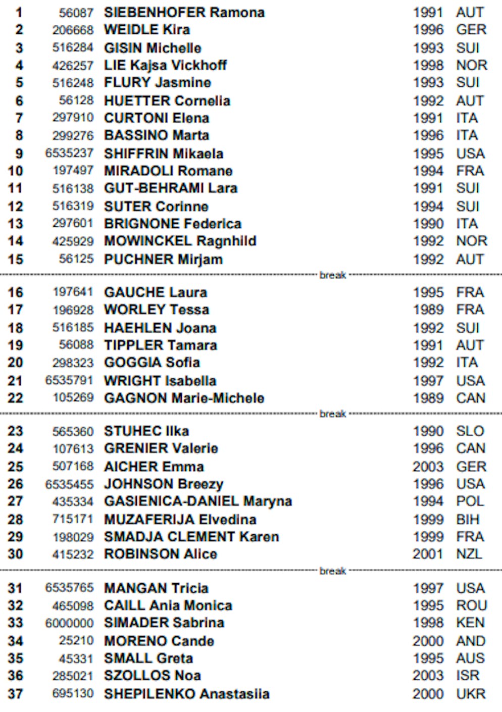 Die 26-jährige Italienerin siegte elf Hundertstel vor Mikaela Shiffrin sowie 33 Hundertstel vor Cornelia Hütter und Kajsa Lie, die sich den 3. Platz teilten. Wie Gut-Behrami gehörten auch die Disziplinenleaderin Ragnhild Mowinckel (5.), Federica Brignone (8.), Sofia Goggia (11.), Ilka Stuhec (12.) und Elena Curtoni (15.) zu den Geschlagenen.