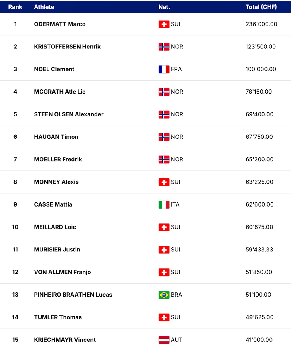 Insgesamt sahnte Odermatt damit Preisgelder in der Höhe von 236'000 Franken ab. Das ist fast doppelt so viel, wie der zweitplatzierte Henrik Kristoffersen (123'500 Franken) und mehr als dreimal so viel, wie Atle Lie McGrath auf Platz vier (76'150 Franken).