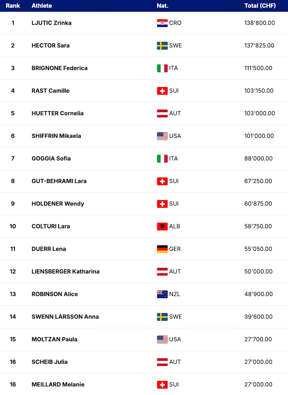 Bei den Frauen führt die Kroatin Zrinka Ljutic die Preisgeld-Rangliste an. Sie kassierte mit 138'800 Franken bislang am meisten. Knapp dahinter folgt die Schwedin Sara Hector mit 137'825 Franken. Das Podest komplettiert Federica Brignone mit einem Gesamtpreisgeld von 111'500 Franken.
