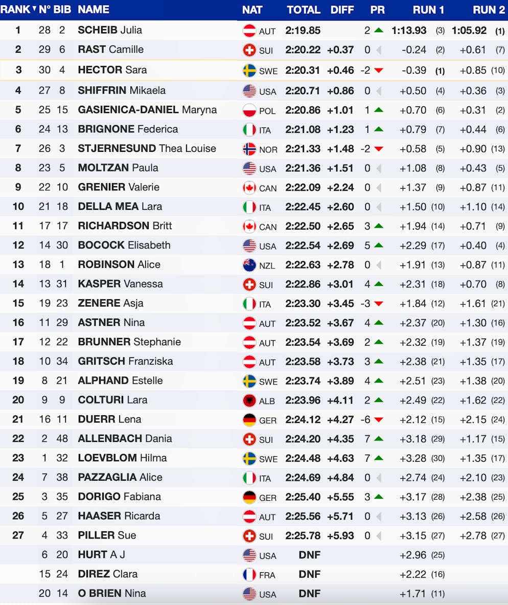 In der Schweiz wird natürlich vor allem über den nächsten Podestplatz von Camille Rast gejubelt. Aber auch dahinter haben einige auf sich aufmerksam gemacht. Vanessa Kasper konnte sich mit einem starken zweiten Run von Platz 18 auf 14 verbessern, während die 18-jährige Dania Allenbach auf Rang 22 auch in ihrem zweiten Weltcuprennen gleich Punkte einfährt. Auch Sue Piller auf Rang 27 greift noch Zählbares ab.