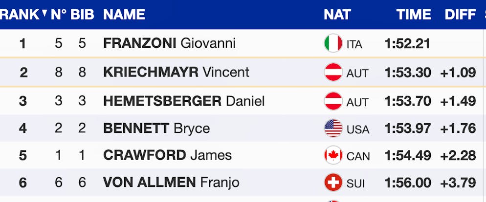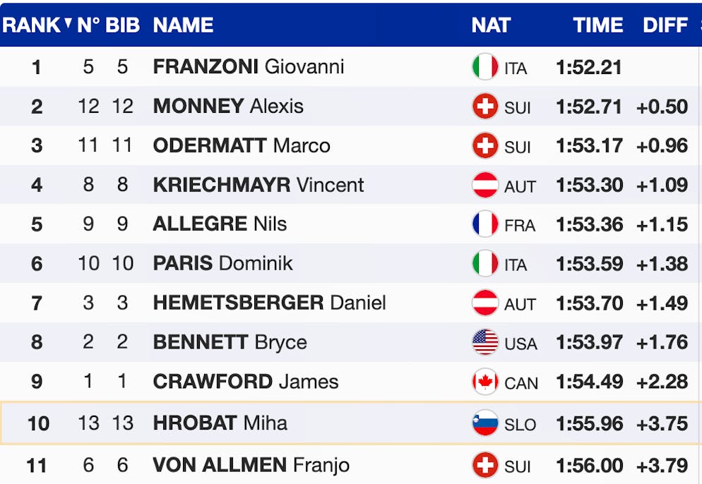 Der Franzose macht Franzoni mit einer starken Fahrt die Bestzeit streitig – bis er sich kurz vor dem Ziel aufrichtet und mit nur 9 Hundertsteln Rückstand auf Platz 2 landet.