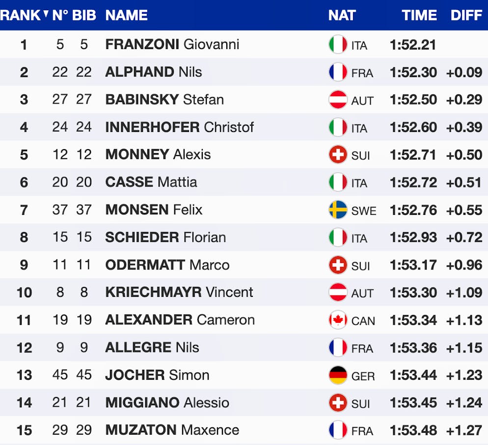 Am nächsten kam dem Trainingsschnellsten Nils Alphand. Der Franzose büsste lediglich neun Hundertstel auf den Italiener ein. Der Österreicher Stefan Babinsky (+0,29 Sekunden) und Franzonis Landsmann Christoph Innerhofer (+0,39) blieben die einzigen Fahrer, die weniger als eine halbe Sekunden einbüssten.
