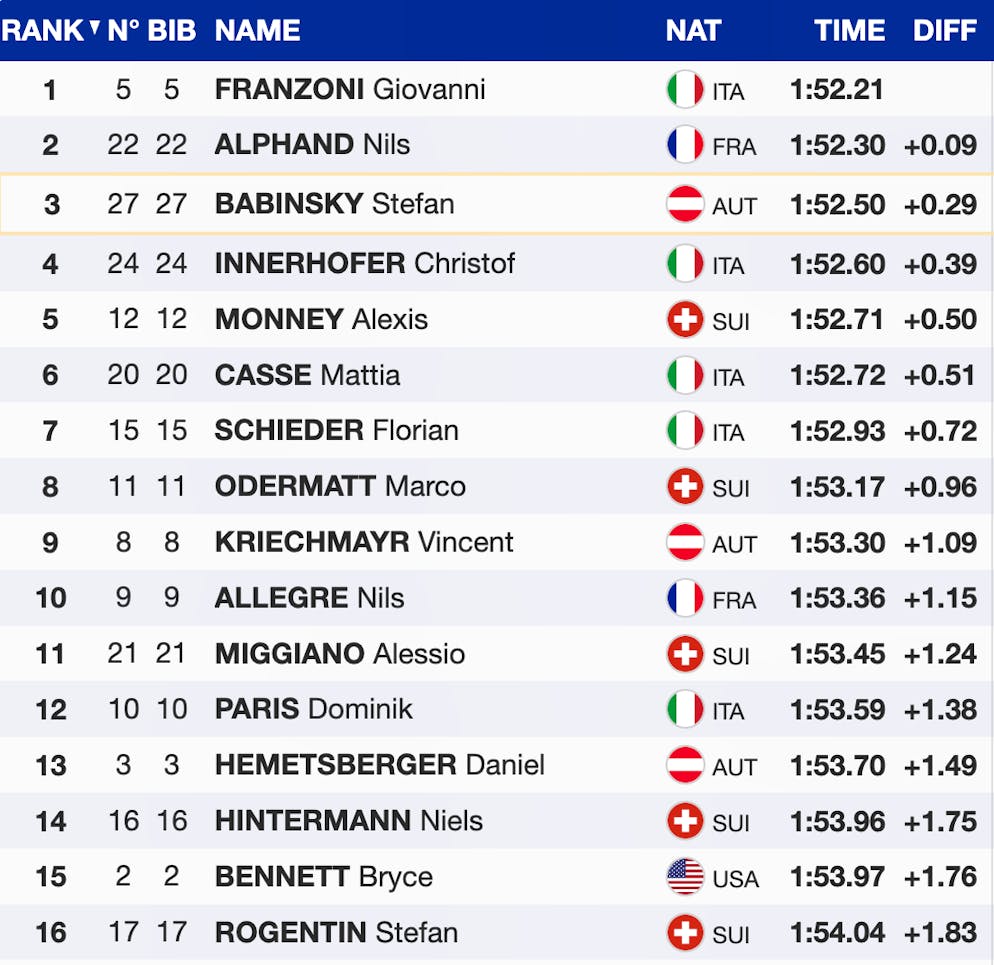 Der Österreicher greift die Bestzeit von Franzoni an und bleibt auch nach dem Zielsprung in der Hocke. Mit nur 29 Hundertstel Rückstand rast Babinsky auf Platz 3.
