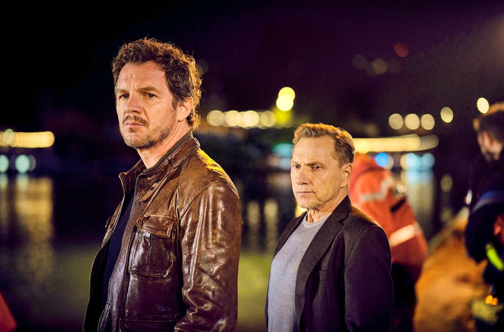 In "Tatort: Ex-It", Thorsten Lannert (Richy Müller, right) and Sebastian Bootz (Felix Klare) are called to the scene of a disturbing corpse found on the Neckar. The car that was pulled out of the river contains a drowned baby, strapped into a child seat. What has happened?
