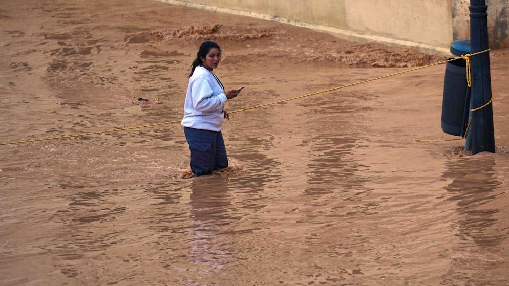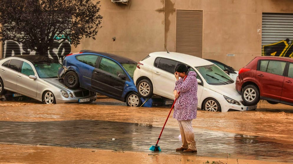 A woman climbs over debris left behind by the floods in the municipality of Paiporta. (October 30, 2024) Image: Keystone/EPA/Manuel BruqueAt least four children and six elderly people in a nursing home are among the dead, according to Spanish media reports. It is feared that the number of victims will continue to rise. An official total number of missing persons was not available. Thousands of people in vehicles, houses and villages also needed help.