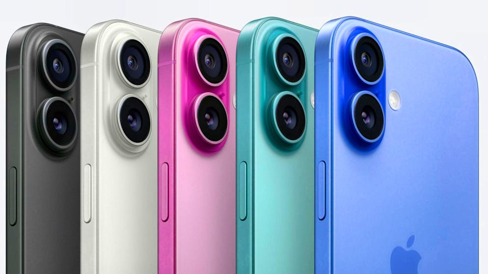 Apple loves it colorful again: The iPhone 16 is available in five colors. In addition to the classic white and black, the new models are available in fresh, pastel shades of ultramarine, blue-green and pink.