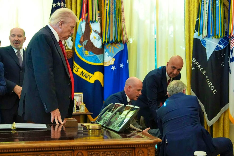 Trump stands in the Oval Office while, behind him, Novo Nordisk executive Gordon Findlay lies on the floor upside down after losing consciousness. https://t.co/8t8Thy7Rze pic.twitter.com/1qmYe17nzD -