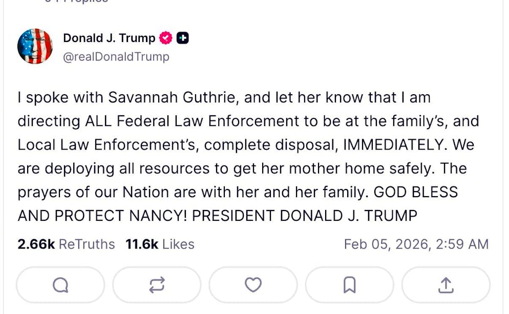 President Trump announced on the Truth Social platform that he had personally intervened in the matter and spoken to Guthrie. He assured her of the support of the federal law enforcement authorities. "We are using all resources to bring her mother home safely." The nation's prayers are with her and her family, he said. "GOD BLESS AND PROTECT NANCY," Trump wrote.
