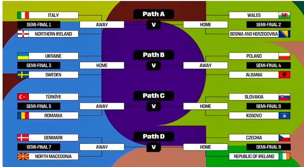 In a possible final on path A, Italy would have to play away to the winner of the match between Wales and Bosnia-Herzegovina.