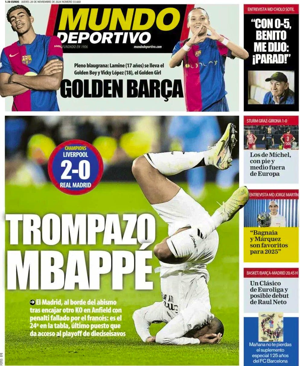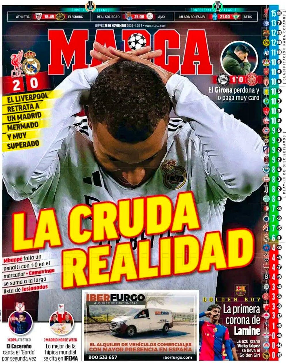 "Kylian Mbappé didn't show up on the day he was needed most. The Frenchman carried his melancholy uninvolved against a superior Liverpool side. When Mbappé missed a penalty to equalize, it was the end of Madrid's chances, who must now tremble for qualification for the playoffs in the winter. A bitter European night. Real Madrid survived for 45 minutes at Anfield. And that was it. In the second half, it was the harsh reality."