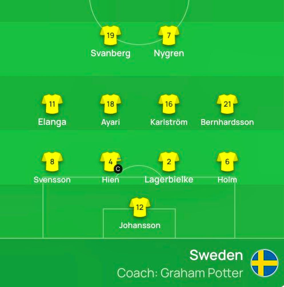 Sweden: Johansson; Holm (50. Gudmundsson), Lagerbielke, Hien, Svensson; Bernhardsson (78. Lidberg), Karlström, Ayari (63. Zeneli), Elanga (78. Forsberg); Nygren, Svanberg (62. Isak).