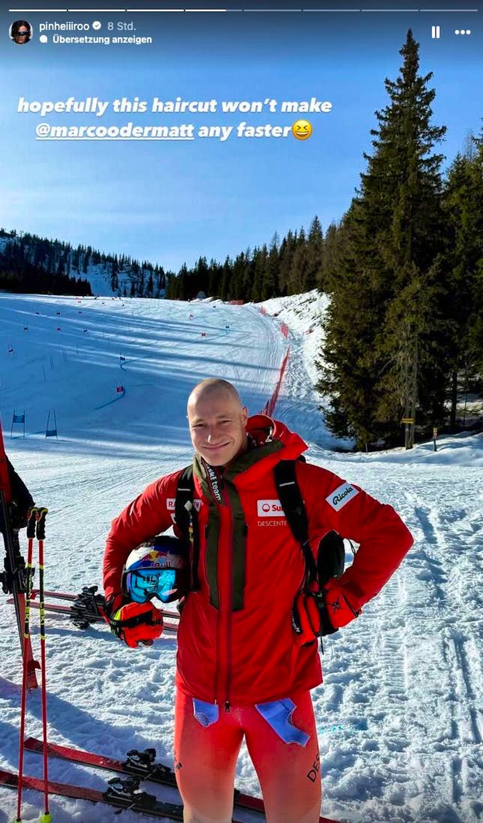 The technical specialist competing for Brazil shares a photo of Odermatt in his Instagram story, showing the Super-G World Champion with a bald head. Braathen's comment: "I hope this haircut doesn't make Odermatt any faster."