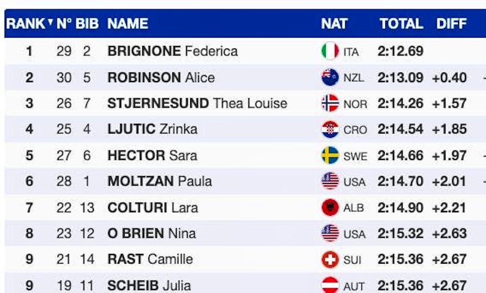 Brignone, who had won the duel against Robinson by nine tenths in the World Championship giant slalom a week ago, was four tenths ahead this time. After half of the race, the New Zealander led the classification by 19 hundredths ahead of Brignone. Brignone and Robinson were once again clearly ahead of the competition. Norway's Thea Louise Stjernesund took third place, more than one and a half seconds behind.