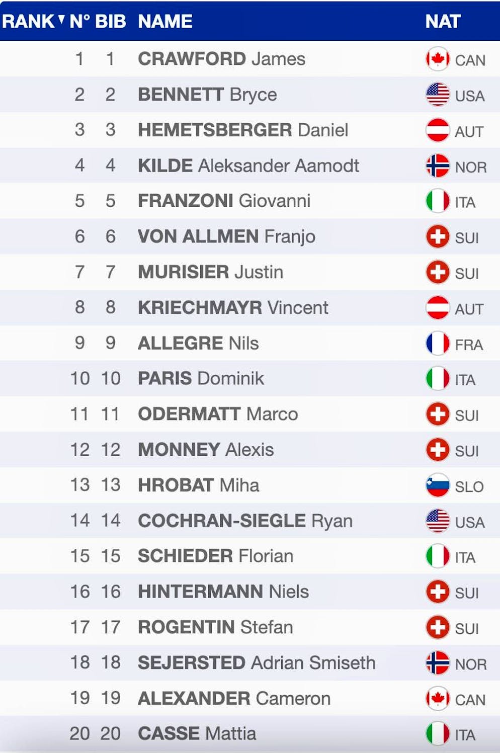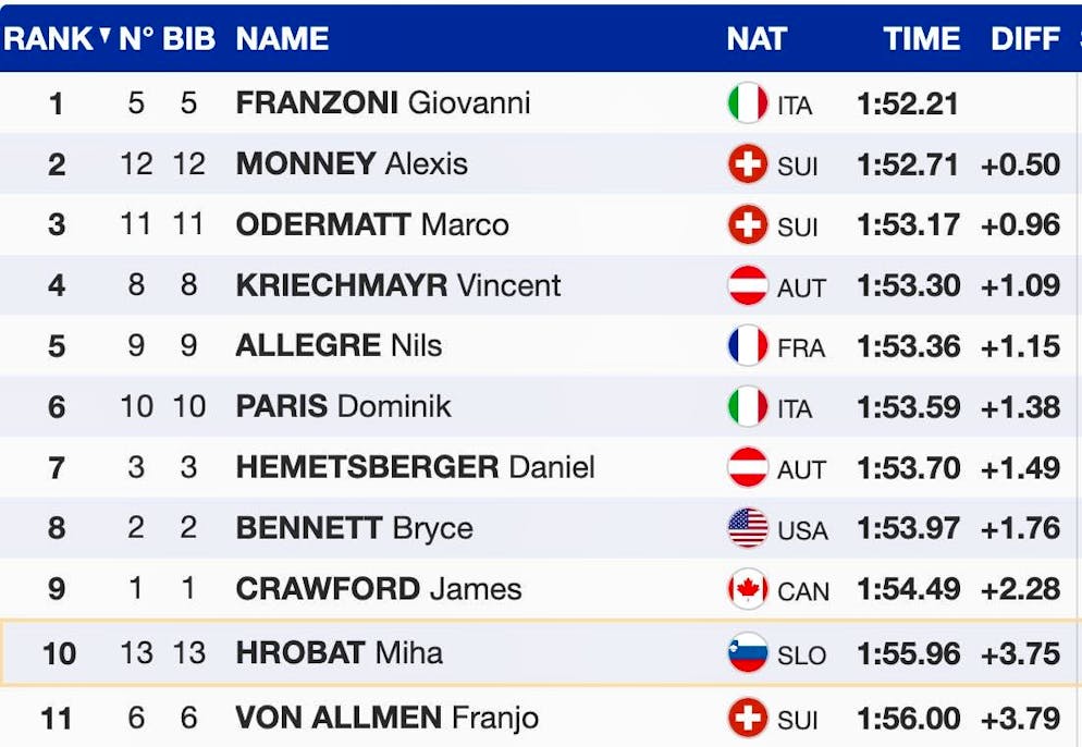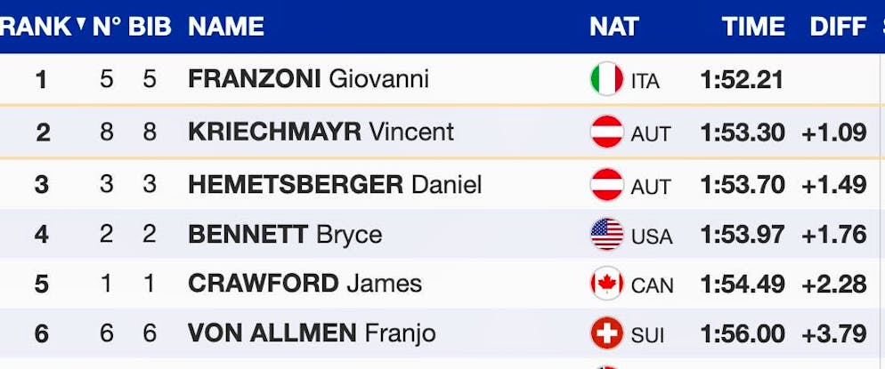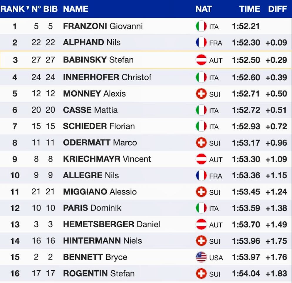 Nils Alphand came closest to the fastest in training. The Frenchman only lost nine hundredths to the Italian. Austria's Stefan Babinsky (+0.29 seconds) and Franzoni's compatriot Christoph Innerhofer (+0.39) were the only skiers to lose less than half a second.