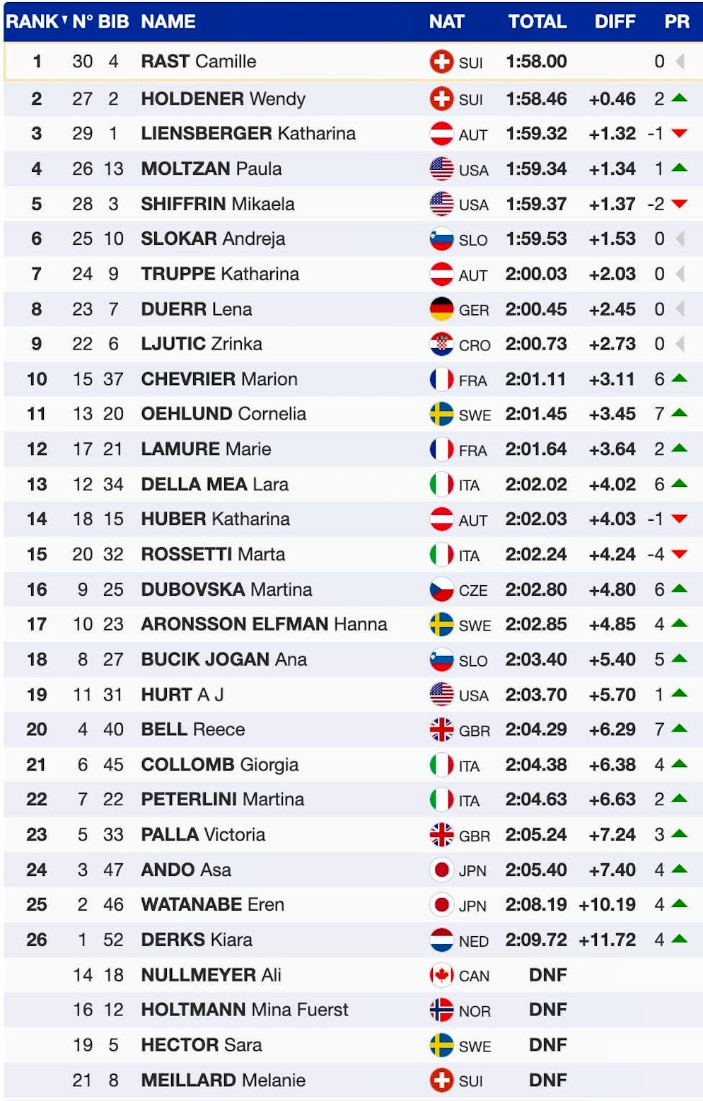 Much had already been said in favor of Camille Rast after half of the race. She had set a best time with a fantastic run, thanks to which she was able to distance herself from her competitors by 58 hundredths and more.