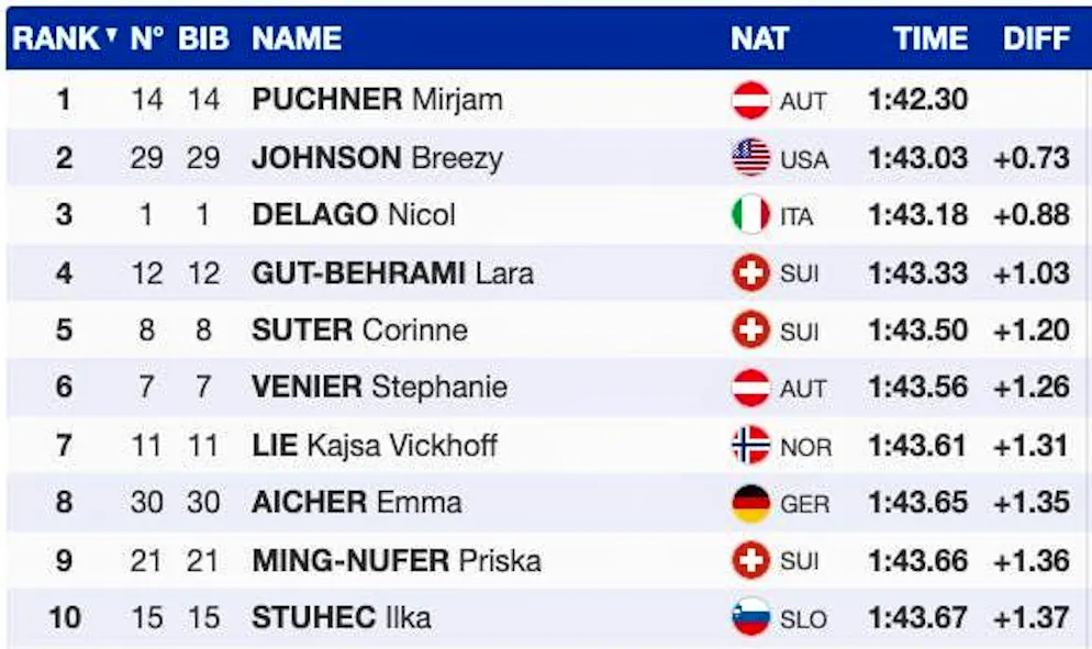 Gut-Behrami is completely different. The winner of the first training session is once again among the front runners. Although the skier from Ticino loses over a second to the outstanding Mirjam Puchner, she still ends up in 4th place, with Corinne Suter right behind her, 1.2 seconds behind.