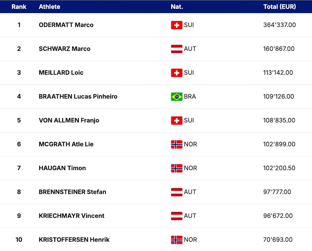 With over 364,000 euros (around 339,000 Swiss francs), Odermatt has already collected more than twice as much prize money as his first runner-up Marco Schwarz (160,000 euros) and roughly as much as second, third and fourth place combined.