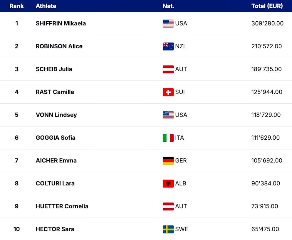 Alice Robinson (210,000 euros) and Julia Scheib (189,000 euros) have also already made considerable gains this season. Unsurprisingly, Camille Rast has cashed in the most among the Swiss women. In the overall ranking, the 26-year-old is in 4th place with 126,000 euros (117,000 Swiss francs).