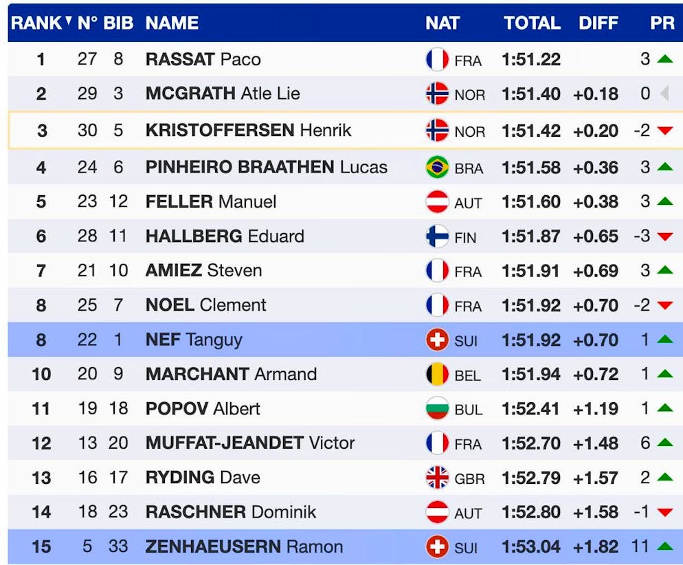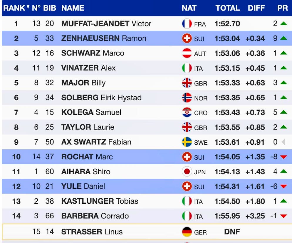 Rassat, who had already won in Gurgl this season and finished third on the podium in Madonna di Campiglio four days ago, moved up from 4th place to the top in the afternoon in perfect conditions with the fastest run time. He relegated McGrath and Kristoffersen to the next places by 18 and 20 hundredths respectively.