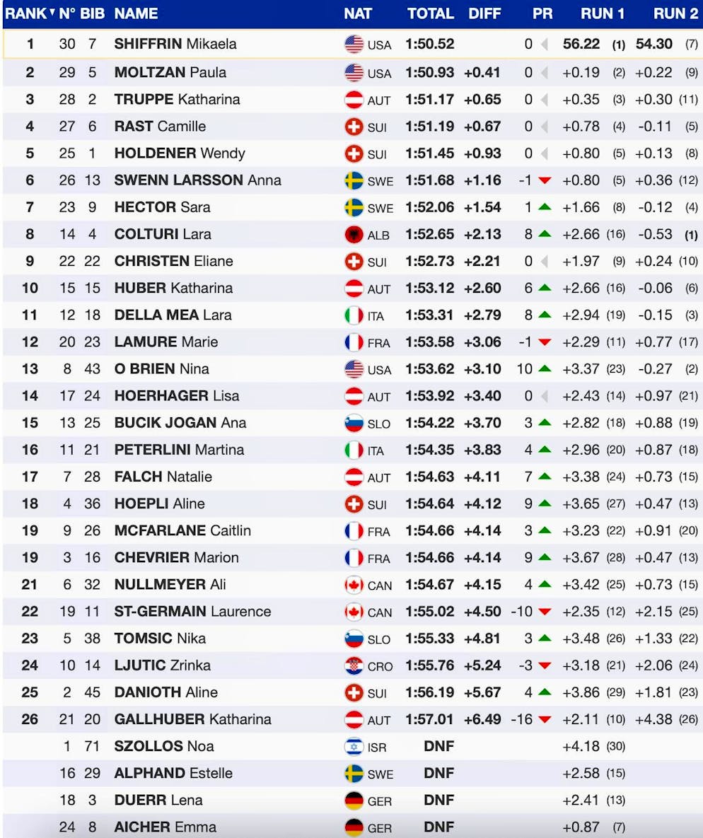 Camille Rast finished just two hundredths behind the Austrian. The skier from Valais thus confirmed her great form. For the first time after five podium finishes in a row, she finished outside the top three, with Wendy Holdener in fifth place only marginally behind her. There were no shifts in rank among the first five racers.