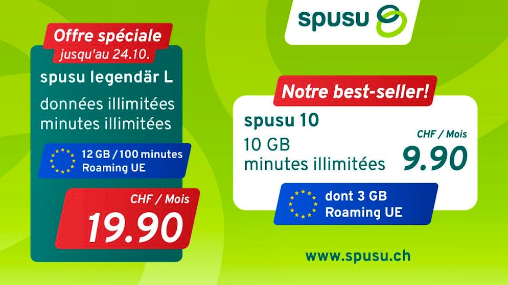 Actuellement, spusu propose l’abonnement «spusu legendär L» avec un volume de données illimité sur le réseau 5G, des minutes et des SMS illimités pour seulement CHF 19.90. Sont également inclus: 12 Go, 100 minutes et 100 SMS en itinérance UE. Pour les petits consommateurs, l’abonnement «spusu 10» à CHF 9.90 avec 10 Go, minutes et SMS illimités et 3 Go en itinérance UE est idéal.