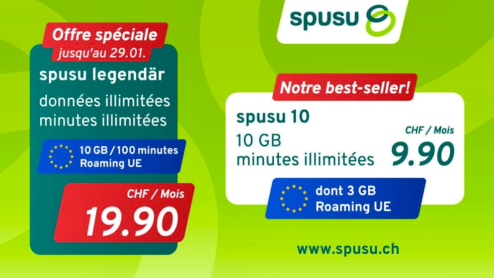 Actuellement, spusu propose l’abonnement «spusu legendär» avec données illimitées sur le réseau 5G, minutes et SMS illimités pour seulement 19.90 francs. Sont également inclus: 10 Go, 100 minutes et 100 SMS en roaming UE.Pour les petits consommateurs, l’abonnement «spusu 10» à 9.90 francs offre 10 Go, des minutes et SMS illimités ainsi que 3 Go en roaming UE.