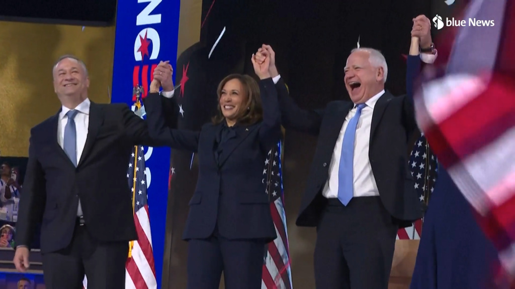 A la fin de son discours, sous la traditionnelle avalanche de ballons aux couleurs des Etats-Unis d'Amérique, Kamala Harris est restée longtemps sur scène à savourer l'exaltation des représentants de son parti, rejointe par son mari Doug Emhoff ainsi que par son colistier Tim Walz et des membres de leurs familles.