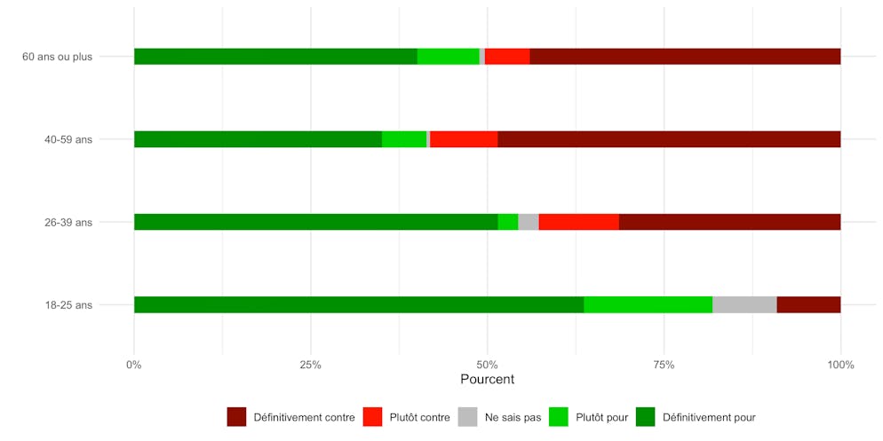 On constate en outre de nettes différences entre les groupes d'âge. Ainsi, chez les jeunes (18-25 ans), l'aversion pour la loi sur le cinéma est supérieure à la moyenne, mais le soutien à la loi sur la transplantation est également plus élevé.